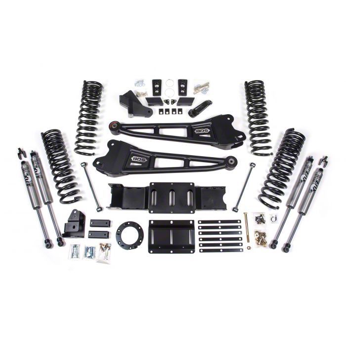 Suspension Lift Kit. Whether your on or off-road, improve your RAM 2500's performance and overall driving feel with this BDS 5.50-Inch Radius Arm Suspension Lift Kit with NX2 Shocks. With utility and convenience at its backbone, this Suspension Kit is engineered to improve on-road comfort and handling while enhancing off-road capability. It sports high strength tubular radius arms, front progressive rate coil springs, rear coil spacers to level out the stance, while allowing clearance for up to 37-inch tires.