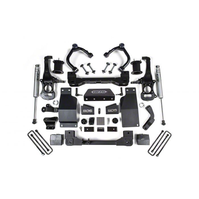 Coil-Over Lift Kit with Fox Shocks. Cruise the highway or conquer the trail in your Sierra with this BDS 6-Inch Coil-Over Suspension Lift Kit with Fox Shocks. It feature high strength 1/4-inch steel crossmembers, precision machined ductile iron steering knuckles, heavy-duty tie rod ends, multipoint differential drop brackets, front and differential skid plates, performance series upper control arms, sway bar relocation, rear block kit and brake line relocation brackets.