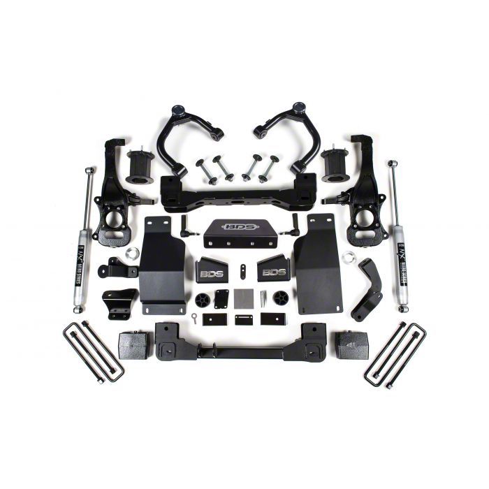 Coil-Over Lift Kit with NX2 Shocks. Cruise the highway or conquer the trail in your Sierra with this BDS 6-Inch Coil-Over Suspension Lift Kit with NX2 Shocks. It feature high strength 1/4-inch steel crossmembers, precision machined ductile iron steering knuckles, heavy-duty tie rod ends, multipoint differential drop brackets, front and differential skid plates, performance series upper control arms, sway bar relocation, rear block kit and brake line relocation brackets.