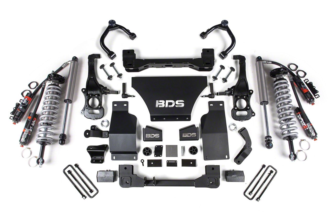 Enhanced Performance and Durability. The BDS 6-Inch Suspension Lift Kit with Rear Lift Blocks, FOX 2.5 Performance Elite Coil-Overs and FOX 2.5 Performance Elite Shocks is engineered to maximize the performance and capability of your GMC Sierra 1500. With increased ground clearance and compatibility for up to 37-inch tires, it allows you to tackle challenging terrains effortlessly.