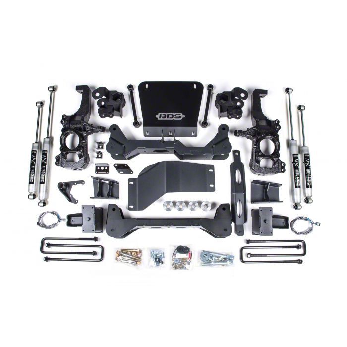 On-Road Comfort and Off-Road Capability. The BDS 6.50-Inch High Clearance Suspension Lift Kit with NX2 Shocks is the ultimate solution for enhancing your vehicle's performance and capabilities. This top-tier suspension lift kit boasts a lift height of 6.50 inches, providing ample clearance to run up to 37 to 38-inch tires, providing on-road comfort while being ready for off-road adventures. Designed to maintain OE-level functionality, this lift kit ensures that your vehicle's essential features and systems remain intact. Each component undergoes rigorous quality testing to guarantee outstanding performance and durability. With premium, precision-crafted materials, you can trust in the reliability of this product.