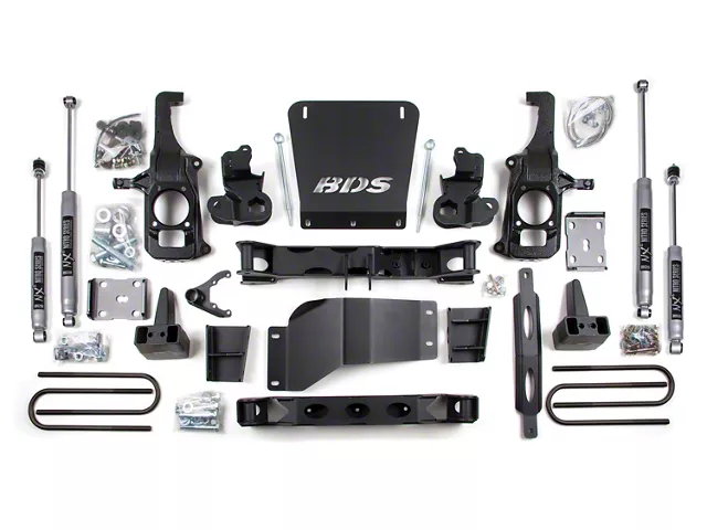 Enhanced Performance And Control. The BDS 6.50-Inch Suspension Lift Kit with 4-Inch Rear Lift Blocks and NX2 Nitro Shocks is engineered to deliver superior on and off-road performance to your 2011-2019 GMC Sierra 2500 HD. This suspension system improves handling and stability, ensuring a smooth ride while maintaining the rugged capability necessary for challenging terrains. With an improved stance and maximized ground clearance, this kit allows your truck to tackle obstacles with ease.