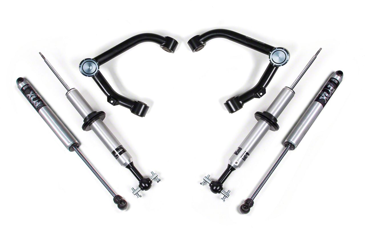 Construction and Appearance. Featuring a combination of matte black, glossy black, and polished chrome finishes, this kit provides both style and strength. The inclusion of performance upper control arms and FOX 2.0 performance shocks ensures improved ride quality, enhanced handling, and durability under demanding conditions.