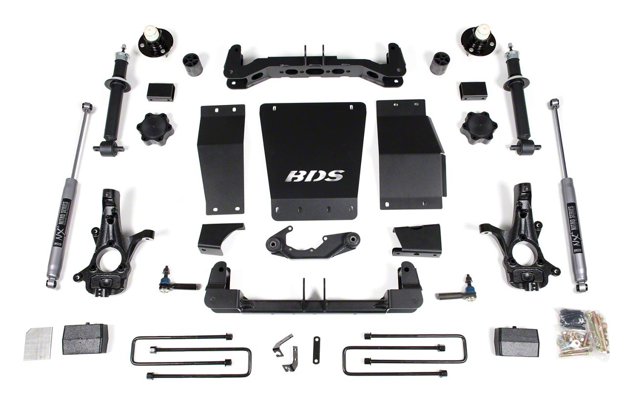 Application. This BDS 4-Inch Suspension Lift Kit with Rear Lift Blocks and NX2 Nitro Shocks fits 2014-2018 4WD Silverado 1500 models with stock cast aluminum or stamped steel control arms.