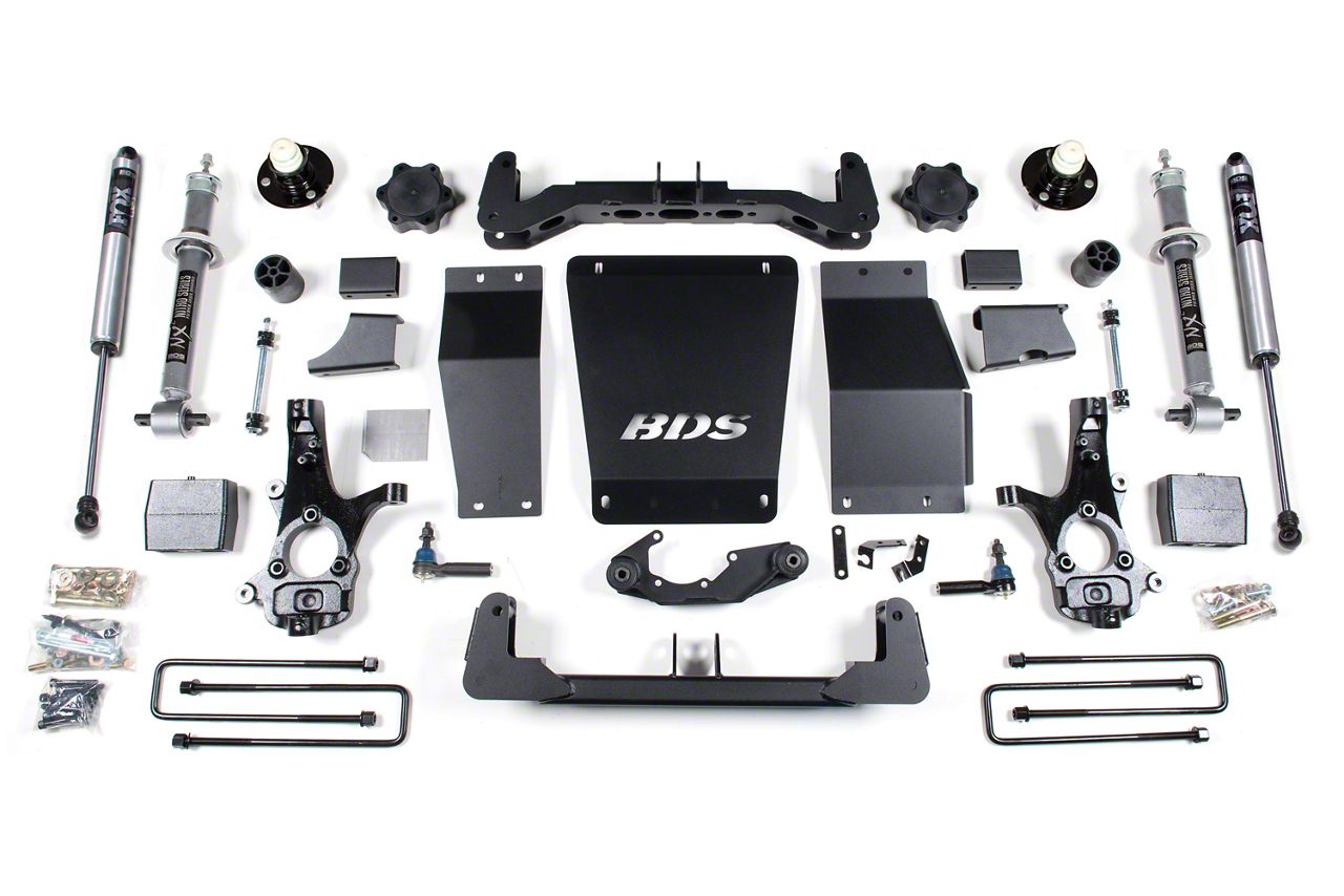 Application. This BDS 6-Inch Suspension Lift Kit with Rear Lift Blocks and FOX 2.0 Performance Shocks fits 2014-2018 4WD Silverado 1500 models equipped with stock cast aluminum or stamped steel control arms.