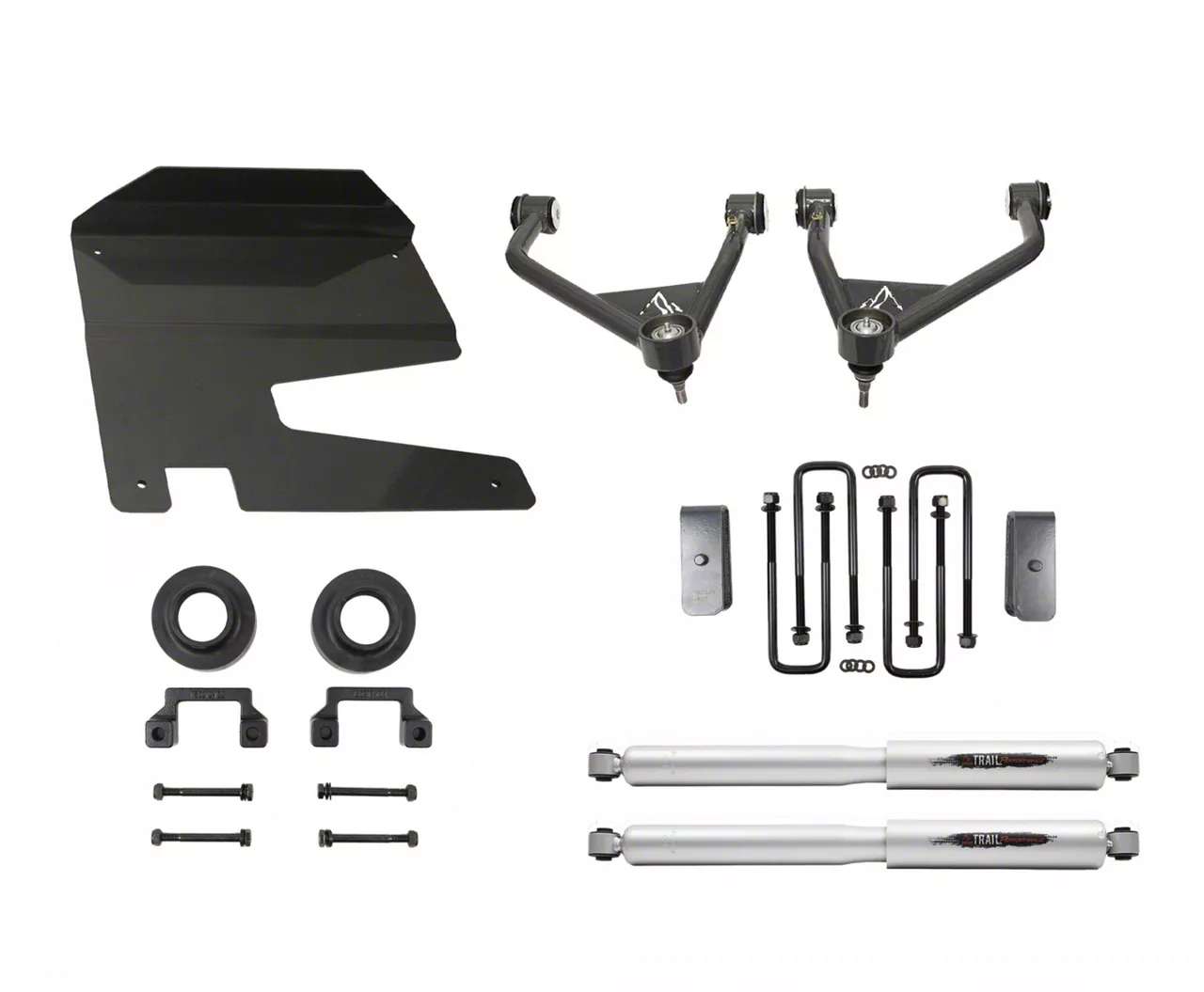 Better Off-Road Performance. Check out the Belltech 4-Inch Suspension Lift Kit with Trail Performance Shocks, a lift kit designed to enhance your off-road driving experience. This kit increases your vehicle's lift height by 4 inches, allowing you to run up to 33-inch tires. It includes tubular upper control arms, spring and strut spacers, and a thick 1/4-inch skid plate for improved stability and control. The rear lift block set with extended U-bolts ensures a smooth ride even on uneven terrain.