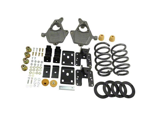 With Front Lowering Spindles. To complete your truck’s lowered stance, this kit also includes front lowering spindles. These front lowering spindles work together with your front coil springs to stagger your truck’s front-end, offsetting your truck to achieve a downward rake.