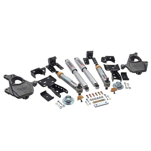 Awesome Looks and Dynamic Handling. Give your Silverado 1500 awesome looks and handling for the street with this Lowering Kit with Street Performance Shocks; 2-Inch Front / 4-Inch Rear by Belltech. This kit is engineered to lower your truck’s front and rear by 2 and 4 inches, respectively, giving it a more imposing presence on the streets. Additionally, this lowered and leveled look also reduces your vehicle’s center of gravity. These factors help boost handling, particularly when cornering, so your truck drives just as good as it looks.