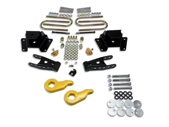 Basic Installation Steps. This Belltech lowering kit is simple to install and takes 2 to 4 hours to complete. Slip on the shackles and hangers to drop down the leaf spring height, and modify your torsion bar tension for a lower level.