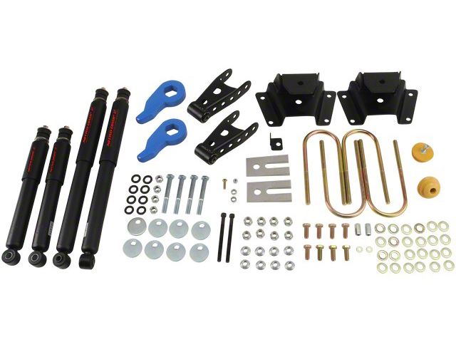 Smooth and Sexy. Your truck will take on a silky smooth stance and literally glide down the road with this stage 2 lowering kit from Belltech installed. The kit drops the truck height 1"" to 3"" while smoothing its performance out. The kit features replacement shock absorbers and shackles to lower the front and back. It goes on easily and will give you that low-rider look that you've always wanted on your truck. Whether you want improved fuel efficiency, you want style points, or just a truck that uses smaller wheels, this kit is exactly the way to accomplish all that and more.