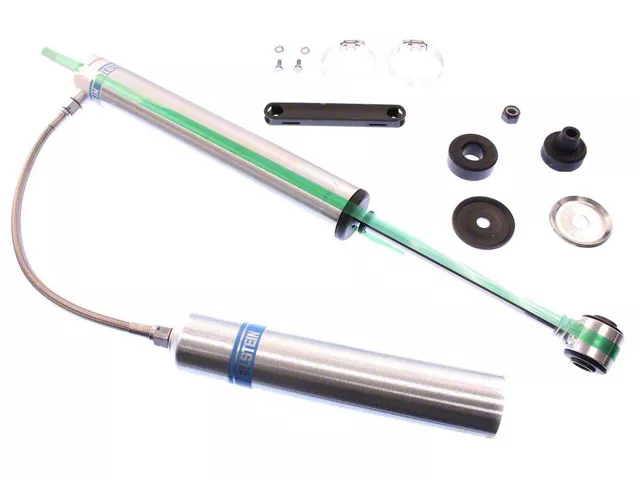 Construction and Appearance. Produced in a state-of-the-art facility, the B8 5160 shock is crafted with a Triple-C Technology Finish and a gas-charged composition. It includes special swivel banjo fittings and a reservoir mounting configuration, all integrated with black rubber bushings. The shock's corrosion- and rust-resistant composition ensures durability and longevity.