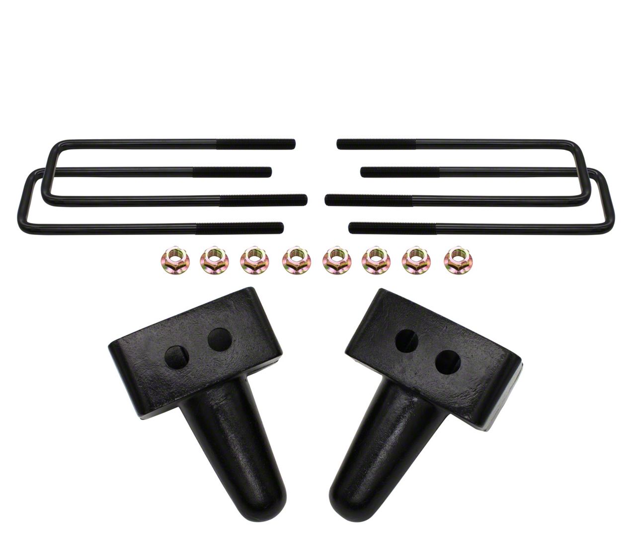 Heavy-Duty Construction. Engineered to fortify your truck’s rear suspension system, these lift blocks are built using heavy-duty material. They also feature a cutting-edge, e-dip, liquid powder coat finish, which makes them impervious to damage caused by corrosion.