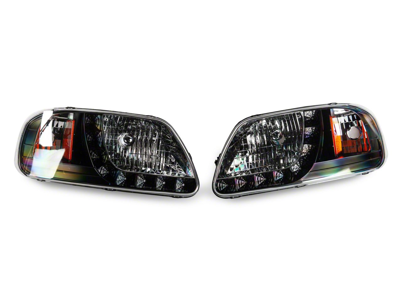 Upgraded Style. These Black 1-Piece LED Euro Headlights set includes a pair of sleek Euro style headlights for your F-150. Easier to adjust than their American-style equivalents, these headlights include a tough looking black housing and clear lenses for maximum visibility. These street legal lights come with a 6 month warranty. A strip of LED Daytime Running Lights and amber reflector corner lights round out the design.