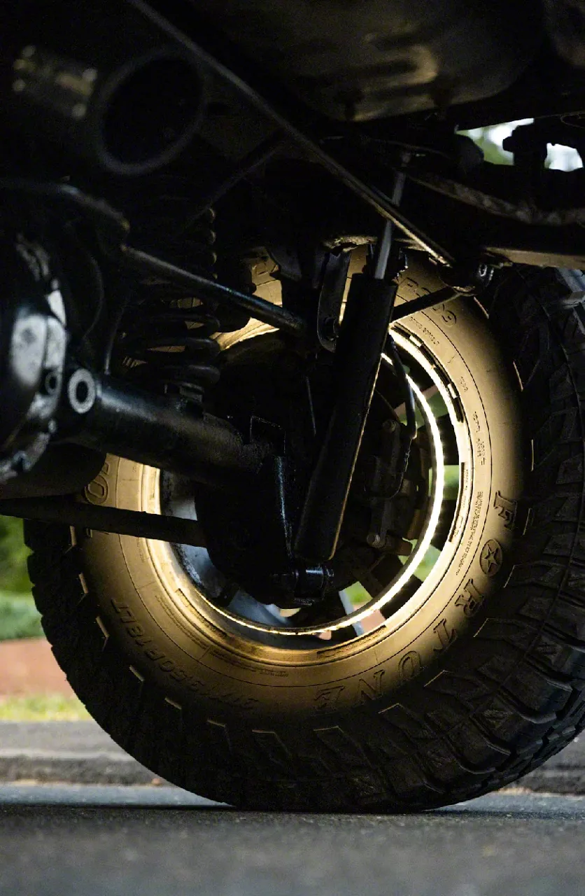 Construction and Appearance. These LED wheel lights feature a robust dual-row design that produces powerful, even light output. With an IP68 water and dustproof rating, they are crafted to withstand various weather conditions, making them suitable for all-season use. The stylish pure white light complements any vehicle color, adding a modern touch to your wheels while enhancing nighttime visibility.
