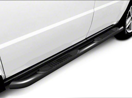 Fine-Looking, Sturdy Steps. Coated in a silky smooth matte black finish and featuring a round tubular design with curved ends, these 3-inch Round Side Step Bars are a swanky-looking addition to your 2009-2018 Ram 1500 that’s also a functional boost. Large slip-proof step pads are fitted to each bar, mounted in saddle style for easier accessibility to your foot. These components are tough steel constructions that are capable of defending the rocker panels of your Ram 1500 to some extent in addition to serving as steps. They are also designed for a sleek ultramodern appearance.