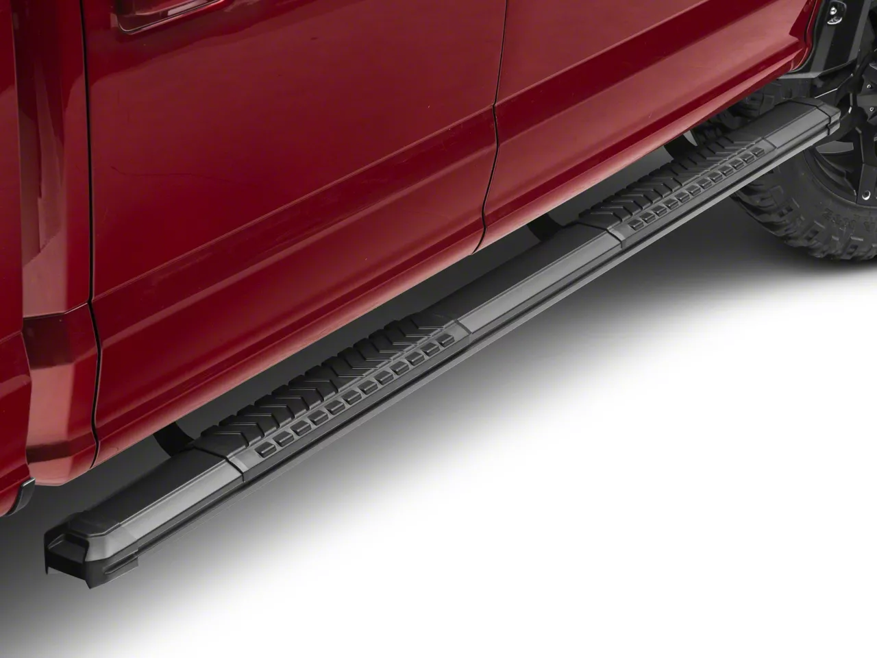 Advanced Footing. Climbing in and out of your 2015-2026 Ford F150 can be difficult, especially for children and the elderly. With these Black Cutlass Running Boards, this problem is solved as they provide steady, wide footing for entry and exit from the cab in any weather, thanks to the easy-grip durable step pads. The aggressive styling and mirror-polished, aircraft-grade stainless steel trim also gives your truck a big truck look without any effort, so it always looks heavy-duty and intimidating. These running boards double as side protection as well, so your truck will be protected from any obstacles on or off road.