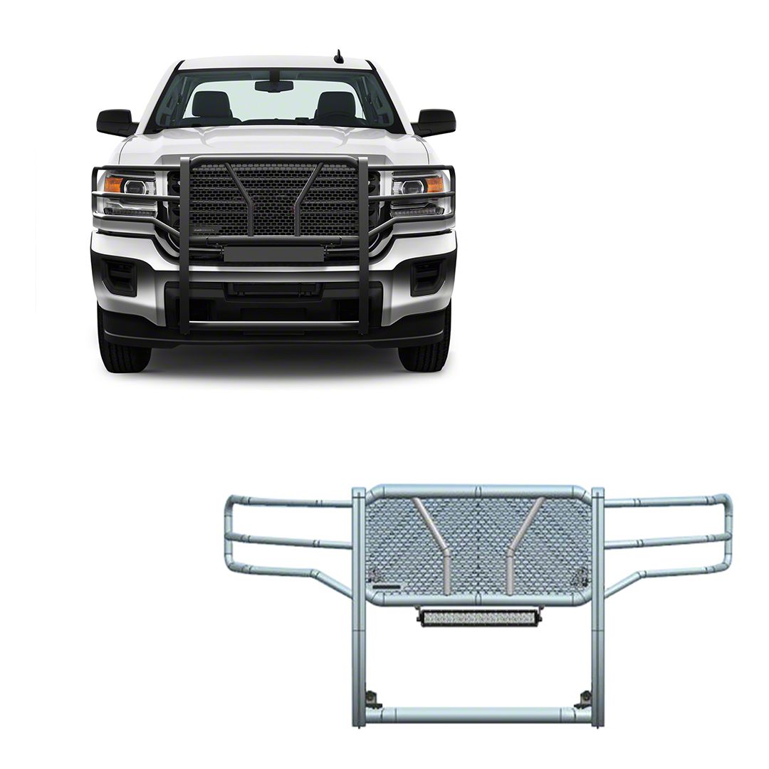 Patented Grille Guard. The modular 3-Piece grille guard from Black Horse Off Road features a patented rugged design and excellent front-end protection. The grille protects your vehicle from accidental collisions with animals, tree branches, and various extreme environments. The grille guard transforms your GMC Sierra 3500 HD into an efficient off-roading machine and keeps your engine, bumper, and headlights safer.