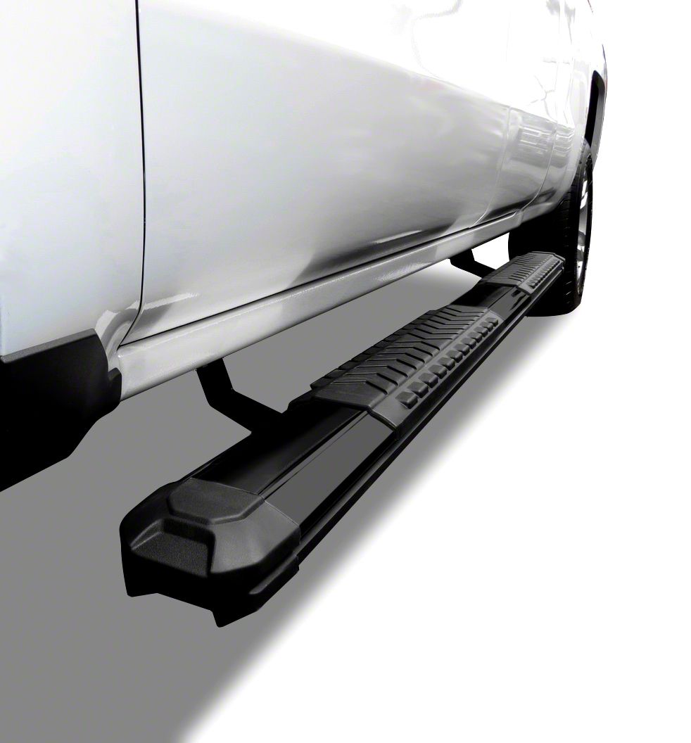 Lightweight but Sturdy Construction. These running boards are made from precision-extruded aluminum with a corrosion-resistant e-coating and topped off with a layer of black powder coat for added durability. The 5-inch step pads are molded out of a UV- and an impact-resistant polymer that provides a sure grip. They also won’t fade or crack easily, even under extreme weather. These running boards also extend the full length of the cab, with matching aerodynamic end caps that help minimize mud and rain splatters.