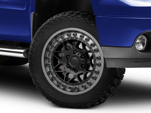The 20x10 Black Rhino Alpha Matte Black with Gunmetal Lip 6-Lug Wheel; 20x10; -18mm Offset is completed in a high-quality black finish for an aggressive appearance that will make everyone green with envy. The gunmetal lip is a wonderful contrast.