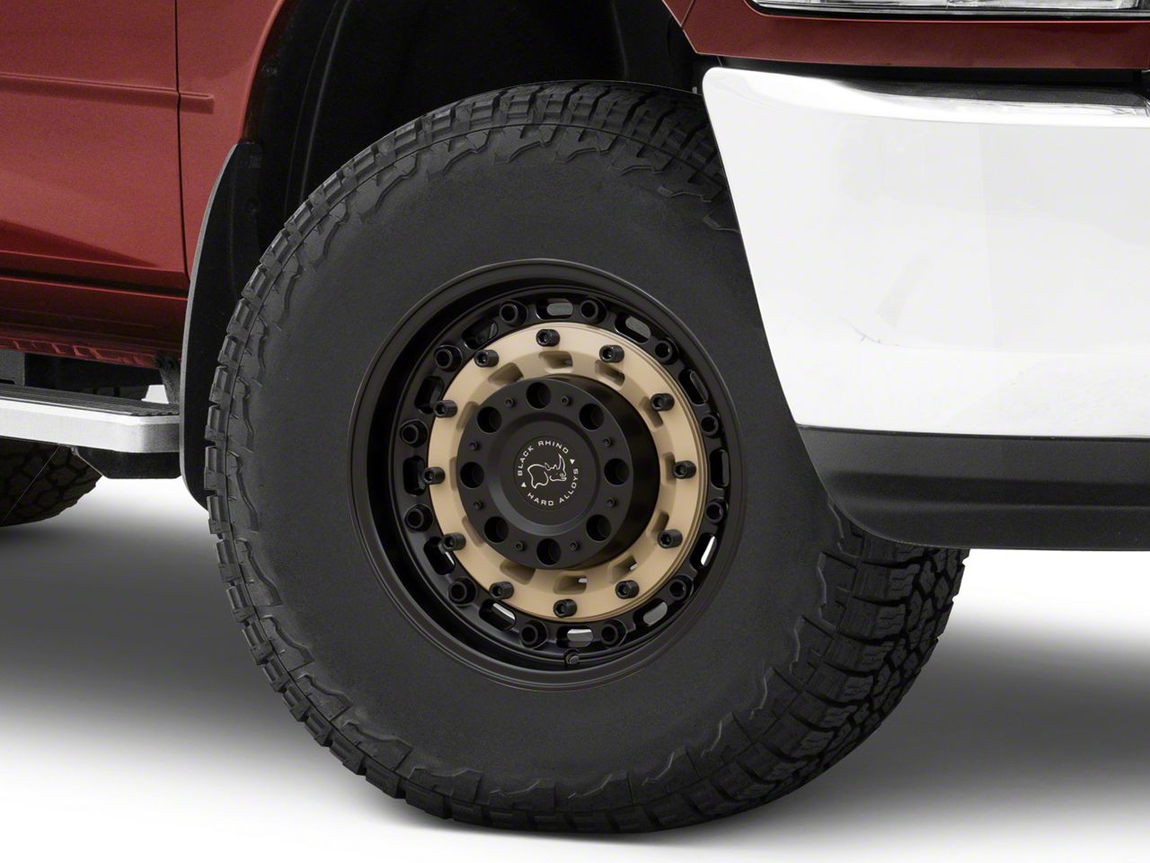 Application. This Black Rhino Arsenal Sand on Black 8-Lug Wheel; 17x9.5; -18mm Offset with a backspace of 4.542 Inch, 115.4mm; and bolt pattern of 8 x 165.1mm (8 x 6.5-Inch) contributes to impeccable alignment and driving stability. Designed to fit 2010-2018 RAM 3500 SRW models, sold individually.