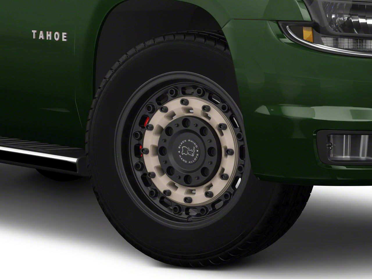 Application. This Black Rhino Arsenal Sand On Black 6-Lug Wheel; 20x9.5; -18mm Offset, with a backspace of 4.541 Inch, 115.3mm and bolt pattern of 6 x 139.7mm (6 x 5.5-Inch), ensures proper alignment and stability. It's designed to fit the 202015-202020 Tahoe models, enhancing both the look and the overall driving experience. Sold individually.