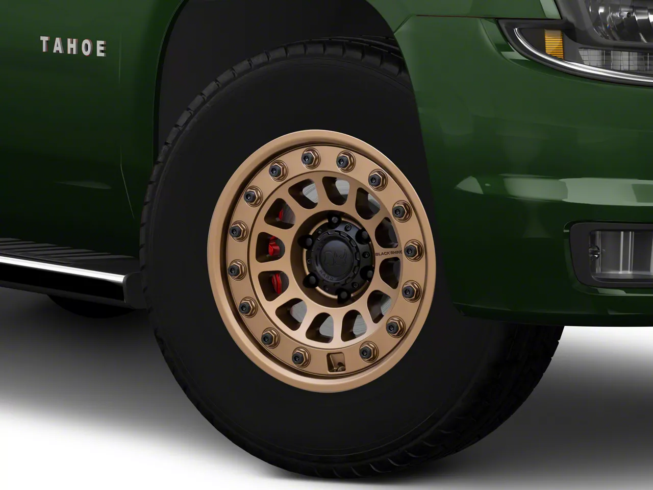 Application. This Black Rhino Outback Matte Bronze 6-Lug Wheel; 18x8.5, with a backspace of 4.75 Inch, 120.6mm and a bolt pattern of 6 x 139.7mm (6 x 5.5-Inch), is designed to enhance alignment and driving stability. It's specially designed to fit the 2015-2020 Tahoe models, sold individually.