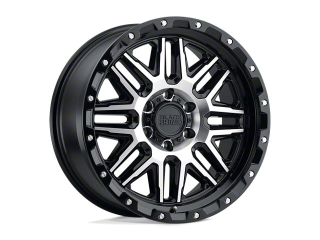 Black Rhino Alamo Gloss Black Machined with Stainless Bolts 6-Lug Wheel; 18x9; 12mm Offset. The Black Rhino Alamo Gloss Black Machined with Stainless Bolts 6-Lug Wheel offers a striking balance of style and refinement. Its unique design accentuates the vehicle's aesthetic, while the premium construction underscores its robust nature. This wheel is a perfect choice for those seeking both elegance and a strong visual statement.