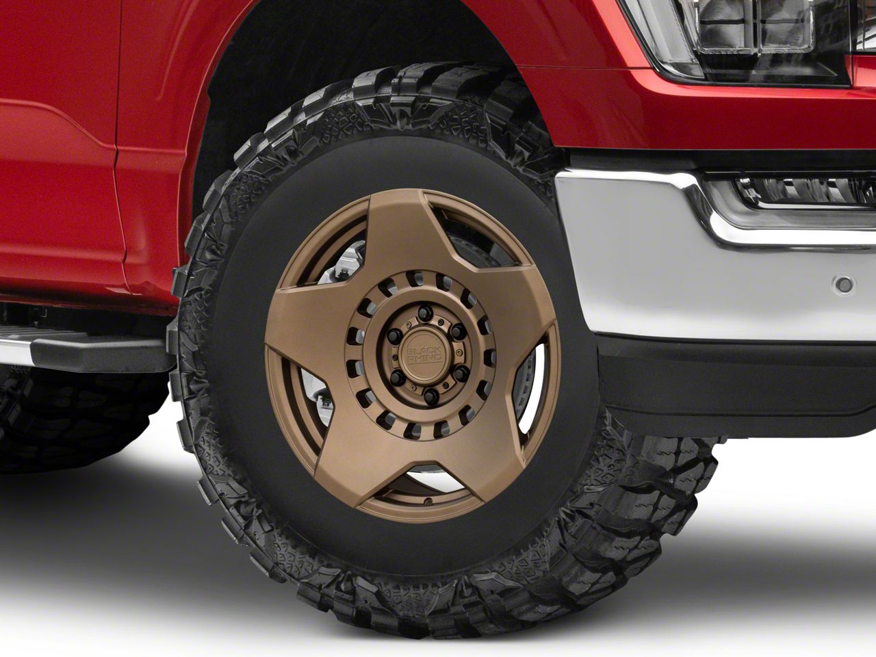 Application. This Black Rhino Muzzle Matte Bronze 6-Lug Wheel; 17x9; 0mm Offset, with a backspace of 5 Inch, 127mm and bolt pattern of 6 x 135mm (6 x 5.31-Inch), is designed to provide not only a striking visual appeal but also to contribute significantly to the alignment and driving stability of the vehicle. Its specifications ensure a precise fit with the vehicle model, enhancing the overall driving experience. Built to fit the 2021-2026 F-150, this wheel is sold individually.