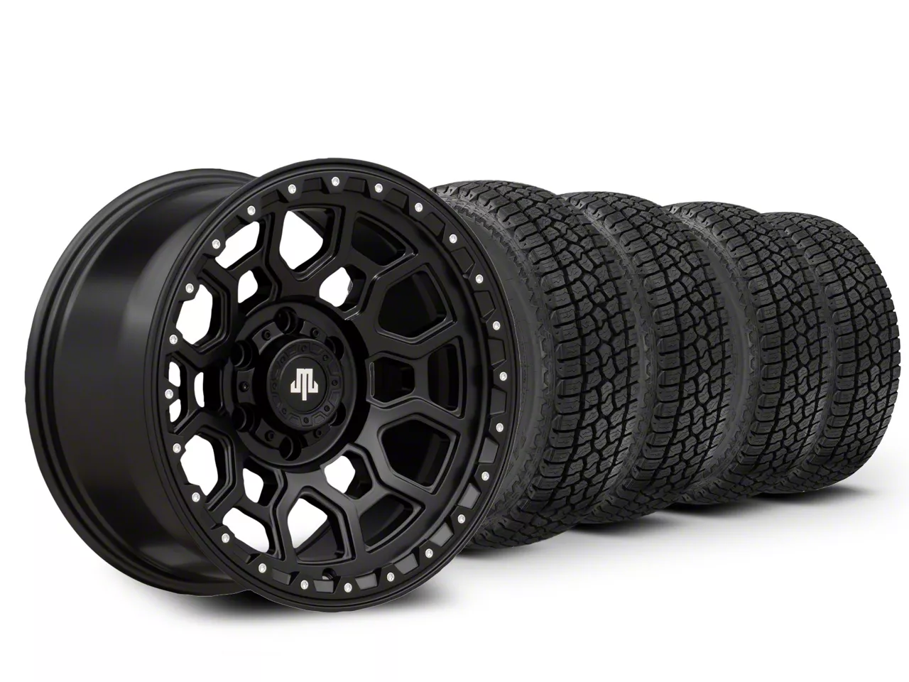 Mounted and Balanced Wheel and Tire Kit. This wheel and tire combo kit features (4) 17x9 Mammoth Hunter Satin Black Wheels and (4) Milestar All-Terrain Patagonia AT/R 33" - 285/70R17 tires that have been put together into an easy to buy kit that arrives to your door already mounted and balanced ready to be installed on your vehicle.