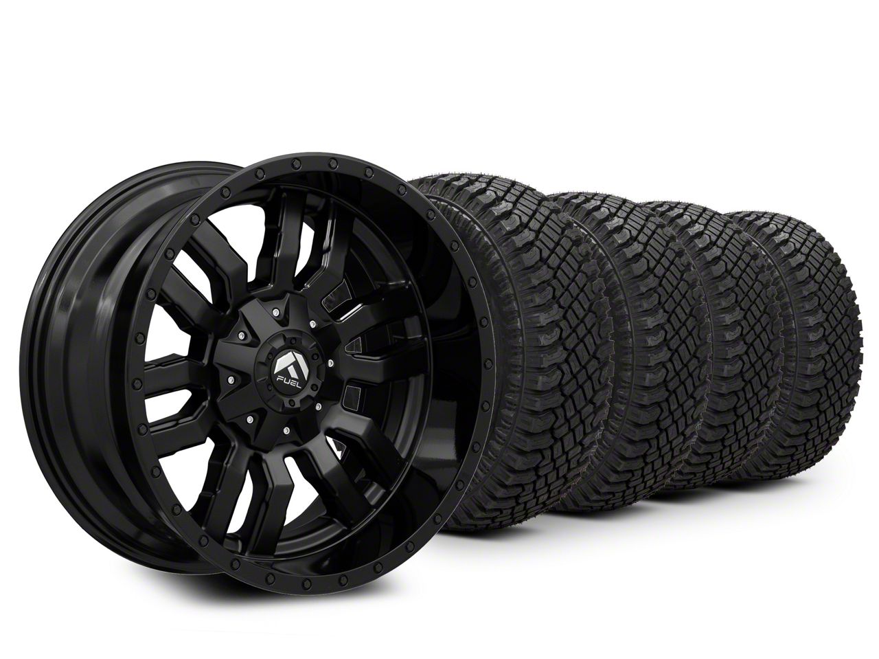 Mounted and Balanced Wheel and Tire Kit. This wheel and tire combo kit features (4) 20x10 Fuel Wheels Sledge Matte Black with Gloss Black Lip Wheels and (4) Atturo Trail Blade X/T Multi-Terrain 33" - 305/55R20 tires that have been put together into an easy to buy kit that arrives to your door already mounted and balanced ready to be installed on your vehicle.