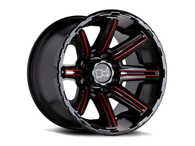 Black Rhino Rampage Gloss Black with Red Inner Lip 6-Lug Wheel; 20x12; -44mm Offset offers a striking balance between style and durability. The design speaks to the brand's commitment to quality, enhancing the vehicle's appearance with its distinct look. This wheel, with its unique aesthetics, is ideal for drivers who appreciate a blend of modern design and robust functionality.