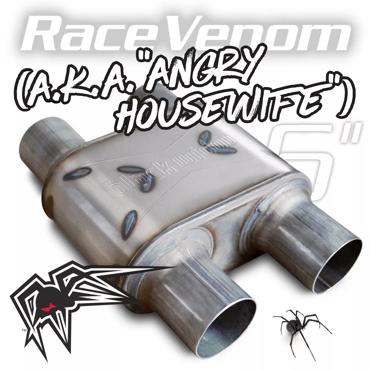 Application. This Black Widow Exhaust Angry Housewife Series Dual/Dual Muffler; 2.50-Inch Inlet/2.50-Inch Outlet fits universal applications. Some adaptation may be required.