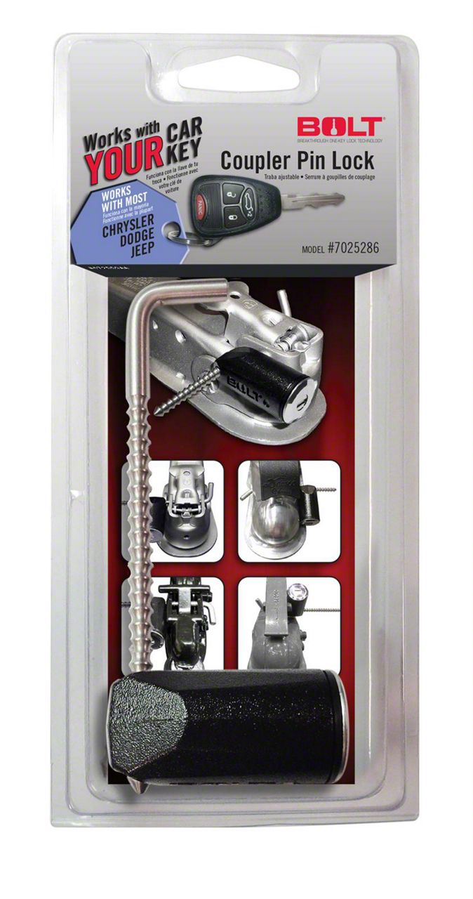 Secure and Convenient Trailer Locking Solution. The BOLT Lock Trailer Coupler Pin Lock is designed to provide maximum security for your trailer couplers while simplifying key management. This innovative lock automatically codes to your vehicle's ignition key, eliminating the need for additional keys and enhancing convenience.