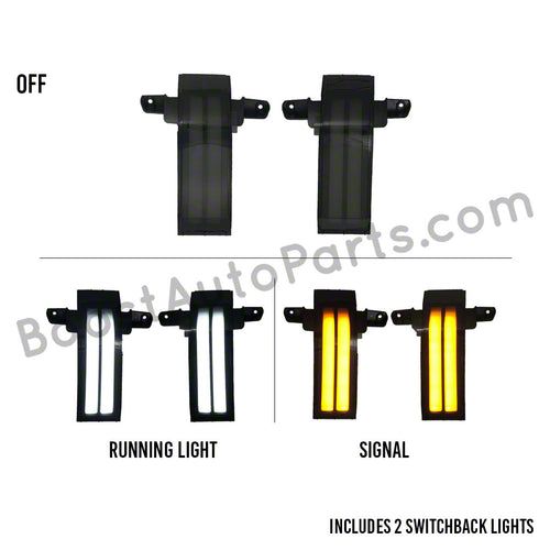 Boost Auto’s drop-in replacement mirror marker lights for 2014-2019 GM 2500/3500 Trucks with the 2015 style GM tow mirrors! These lights feature a smoked lens with a sequential sweeping Amber turn signal and bright White running light. These lights are compatible with OEM towing mirrors with a forward-facing light that functions as a running light only and has the Turn Signal on Glass.Boost Auto’s all-in-one kit makes upgrading your style and functionality a breeze! These lights drop right in place of your original forward-facing running lights and use Boost Auto’s Switchback adapter harness to tap into your Signal on Glass circuit to gain the forward-facing turn signal. Once complete, your new Smoked Sequential Switchback lights will operate as a White running light and a sweeping Amber turn signal.Light Function:• Sequential Switchback: These lights will illuminate White with your running lights ON and flash Amber in a sweeping pattern with your turn signal.Light Features:• High Quality Bright LED Lights• Smoked Lens• Sealed OEM-style connectorsProduct Details:• Sold as set (Left & Right side)• Includes Boost Auto’s Switchback adapter harness