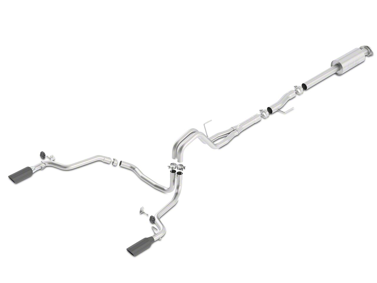 Strong Construction. This Borla ATAK Split Rear Exit Cat-Back is made from 300 stainless steel. This is great because it avoids corrosion and remains strong even in extreme heat. The black chrome finished exhaust tips are large at 4 inches, and they have an angle cut for an intense look. In addition, there is an exit at the rear.