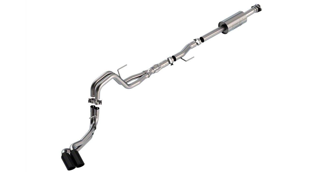 Aggressive Throaty Sound. You can bring some of the Borla excellence to your F-150 by replacing your factory exhaust system with an ATAK Dual Exhaust System with Black Chrome Tips; Same Side Exit. This Same Side Exit ATAK Cat-Back System will significantly increase exhaust flow over the restrictive factory exhaust system for a dramatic increase in rear wheel horsepower and an aggressive throaty sound that is not for the faint of heart.