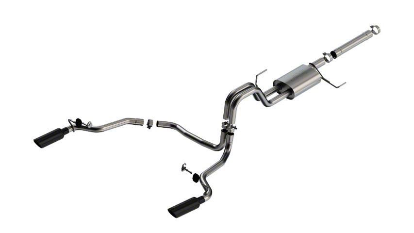 Refined Exhaust Upgrade. Installing the Borla S-Type Dual Exhaust System with Black Chrome Tips can give your Ford the kind of powerful, aggressive racer-like engine roar you're looking for. This exhaust system's expanded oval-type muffler and high-flow tubing have given it a more pronounced revving tone to go with your big rig.