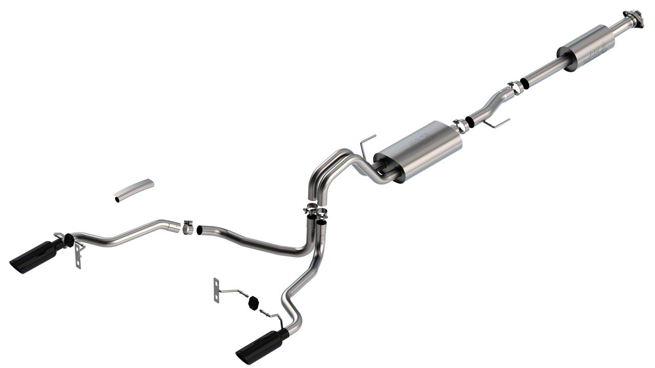 Application. The Borla Touring Dual Exhaust System with Black Chrome Tips; Rear Exit is designed to fit the 2021-2026 5.0L F-150 SuperCab with a 6-1/2-Foot Bed and SuperCrew with a 5-1/2-Foot Bed.