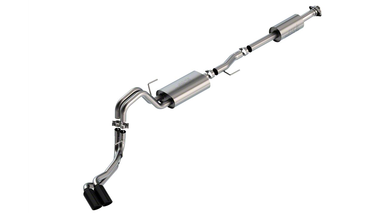 Application. The Borla Touring Dual Exhaust System with Black Chrome Tips; Same Side Exit is designed to fit the 2021-2026 5.0L F-150 SuperCab with a 6-1/2-Foot Bed and SuperCrew with a 5-1/2-Foot Bed.