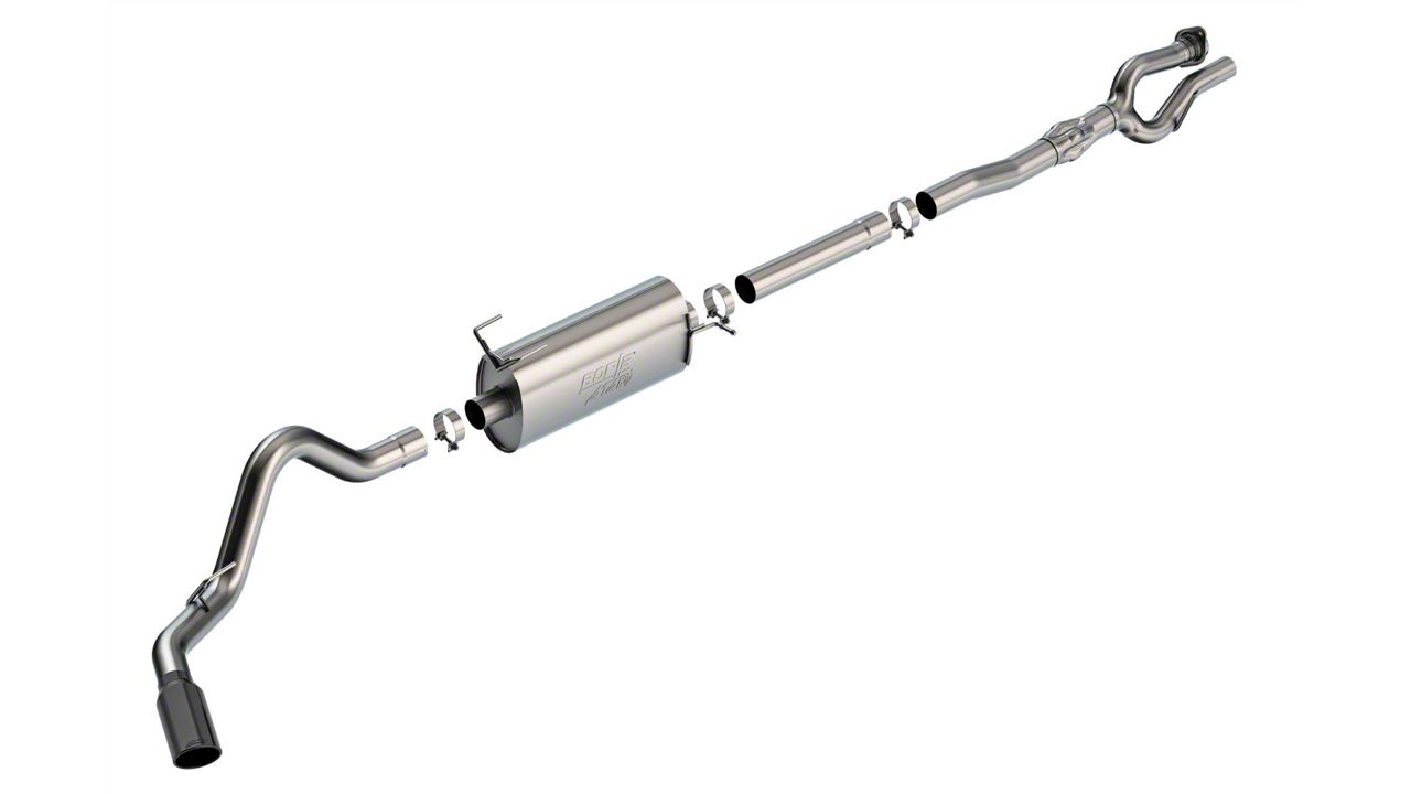 Construction and Appearance. This cat-back exhaust system features dual 2.75-inch inlets merging into a single 3.5-inch outlet, all CNC mandrel-bent for maximum exhaust flow. It incorporates Borla's Polyphonic Harmonizer technology to fine-tune exhaust frequencies, delivering an exhilarating yet refined note. The system finishes off with a bold black chrome tip and side-exit design for an aggressive look and corrosion resistance.