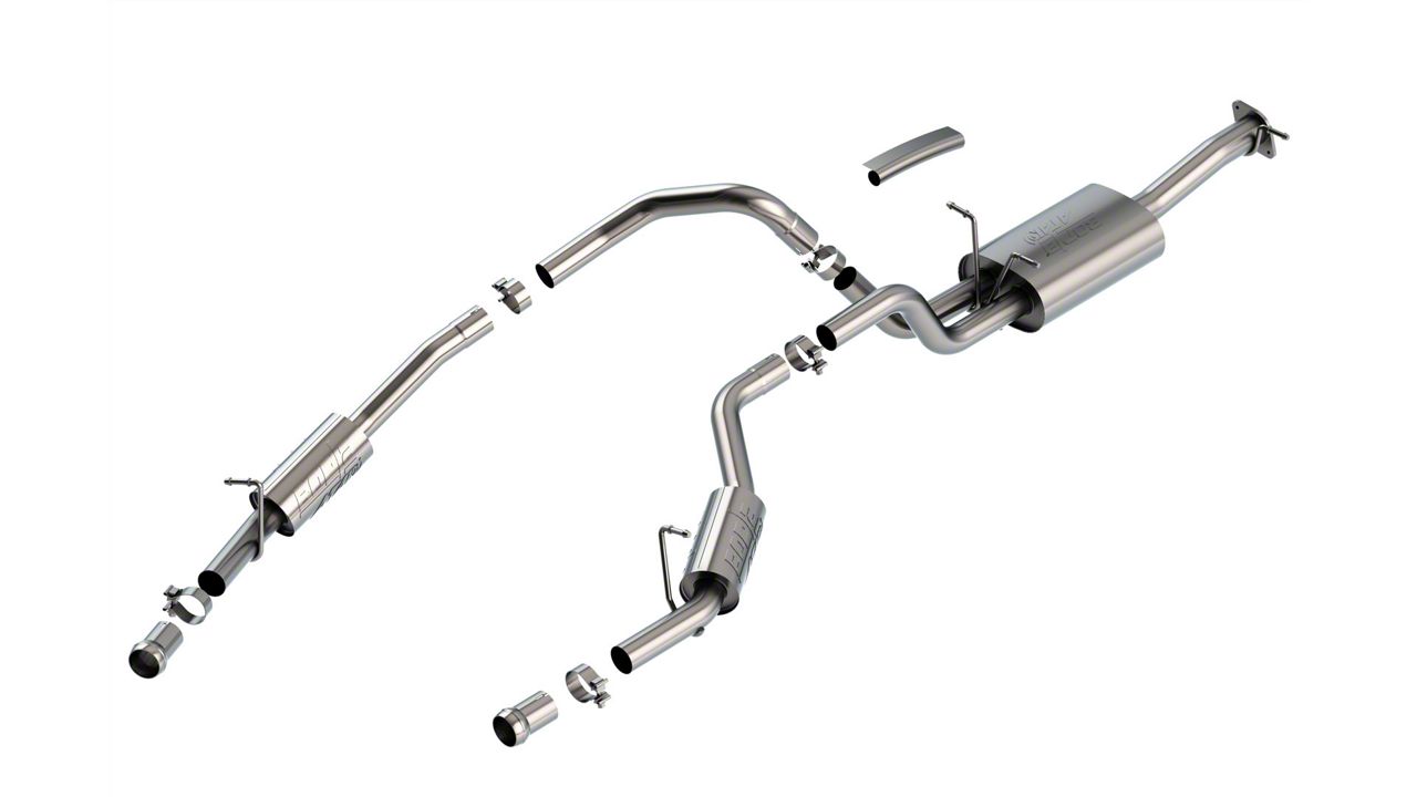 Construction and Appearance. Built from premium T-304 austenitic stainless steel, the system features a 3-inch inlet flowing into dual 2.5-inch outlets for improved performance and exhaust velocity. It uses Borla's patented straight-through and multi-core design, along with polyphonic harmonizer technology for finely tuned acoustics. Mandrel-bent tubing and CNC manufacturing ensure maximum flow and a precise OE-style fit. Note: exhaust tips are not included—reuse factory tips or install Borla tips.