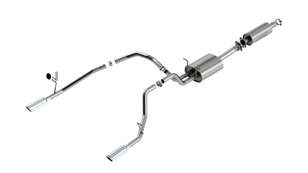 Improves Exhaust Flow. The Borla S-Type Dual Exhaust System with Chrome Tips; Rear Exit is manufactured to deliver a bold and throaty sound. Engineered to improve your exhaust flow, this innovative no drone cat-back increases your horsepower and torque for a superior performance.