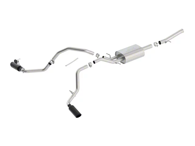 Performance-Grade Exhaust. Unleash untapped performance in your Silverado with this Borla S-Type Dual Exhaust System with Black Chrome Tips; Side Exit. Manufactured for long lasting exhaust performance, this OEM upgrade features a T304 stainless steel composition which far exceeds common steel or aluminum pipping in heat, impact and weather resistance. Additionally, the straight-through design of the muffler, paired with the mandrel bent tubbing provides a faster route for air to travel greatly improving exhaust output and minimizing drone, giving a deeper, more aggressive sound for your mean machine.