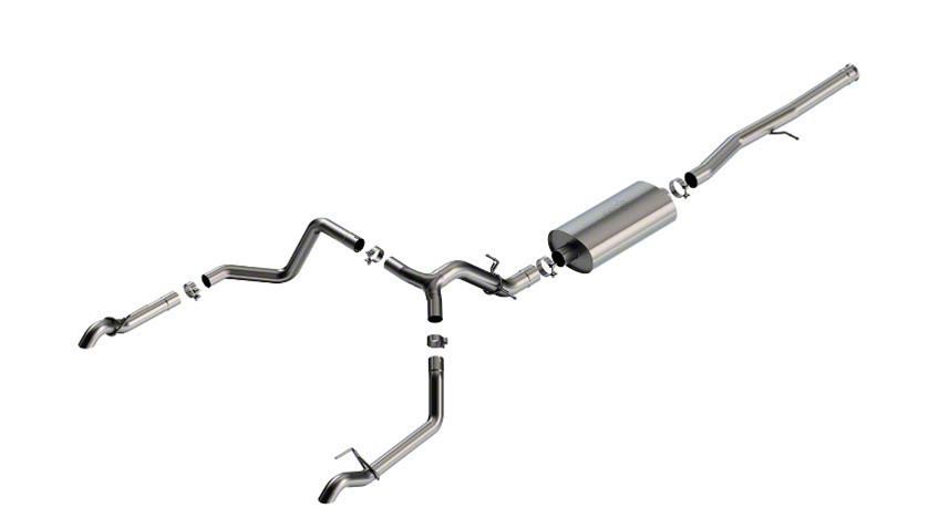 Stainless Steel Built. Elevate your 2022-2023 Silverado 1500 ZR2's performance with the Borla Touring Dual Exhaust System, featuring Turn Down Pipes. This system is designed with a single inlet/dual outlet configuration and a stylish rear exit, offering a notable enhancement to your truck's exhaust flow and aesthetic. Constructed from high-grade 304 stainless steel, it ensures durability and longevity.