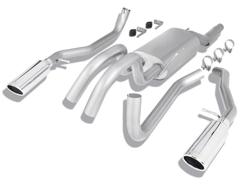 Loud Exhaust Tone. When you rev your engine, the Borla Touring Split Rear Exit Cat-Back Exhaust System does its job to give your truck a boost to its growl. This is done with a Touring Muffler, which filters sound rather than strangling it. However, your truck's cab will be devoid of any overwhelming sounds or annoying droning.