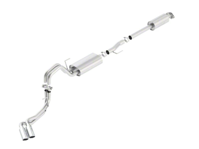 Drive Faster. Go faster and drive with more confidence when you have this Borla Stinger S-Type cat-back exhaust system installed. It features a straight-through muffler, a wide 3" intake pipe and two 2.25" tailpipes with 4" tips at the ends. These pipes are mandrel bent and won't kink up exhaust fumes. This careful design pattern and the materials used ensures that you get smooth flowing exhaust that does not limit your engine in any way. Compared to the heavily restrictive exhaust that comes with your truck, this kit can leave you with more power to work with. When installed you'll have more horsepower overall.