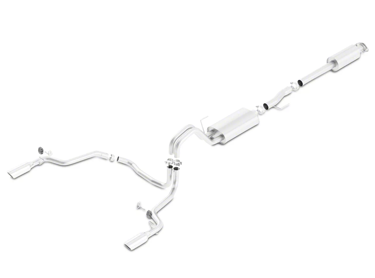 Throaty Exhaust Tone. The Borla Stinger ""S-Type"" Split Rear Exit Cat-Back Exhaust System is made to give your Ford F-150 the throaty sound that its supposed to have. Instead of the strangled sound that can result from an oversized factory mufflers choking both deep and high tones. This muffler, however, carefully filters the sounds to give you an aggressive growl when you rev your engine and peace inside the cab.