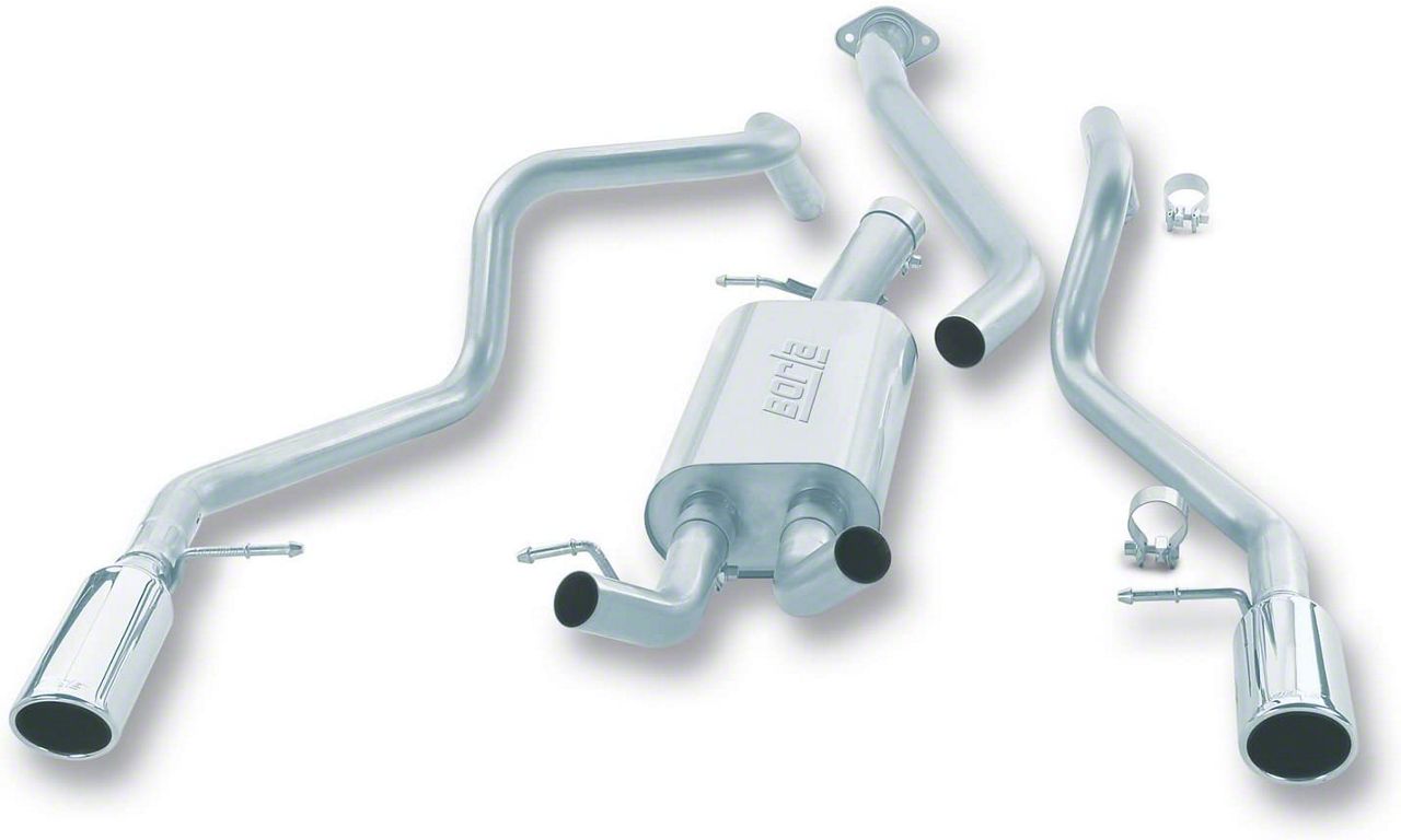 Performance. The Borla Touring Dual Exhaust System boasts its high-performance combined with an amazing soundtrack on the back. When you want the best performing, best sounding, and highest quality exhaust system, you want Borla. Borla straight-through mufflers and mandrel-bent exhaust tubes are custom-tuned to deliver the most horsepower possible, with a subtle, slightly louder than stock sound at cruise.