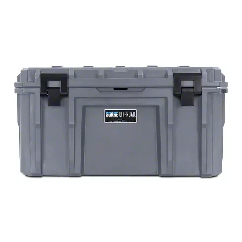 Highly-Durable Case. Crafted from rotomolded polyethylene HDPE in a sleek light grey, the Borne Off-Road Hard Case exudes both style and strength. Its military-grade lid seal and sturdy steel latches provide enhanced security and protection against the elements. Designed for durability, this case is stackable and crush-proof up to an impressive 2,000 pounds, ensuring your belongings stay safe even in rugged conditions.