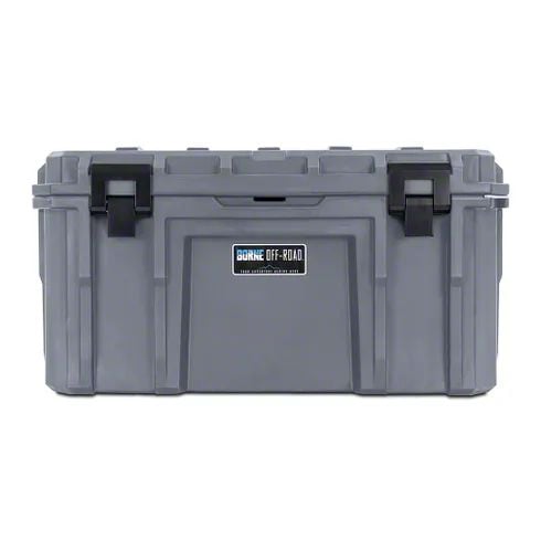 Highly-Durable Case. Crafted from rotomolded polyethylene HDPE in a sleek light grey, the Borne Off-Road Hard Case exudes both style and strength. Its military-grade lid seal and sturdy steel latches provide enhanced security and protection against the elements. Designed for durability, this case is stackable and crush-proof up to an impressive 2,000 pounds, ensuring your belongings stay safe even in rugged conditions.